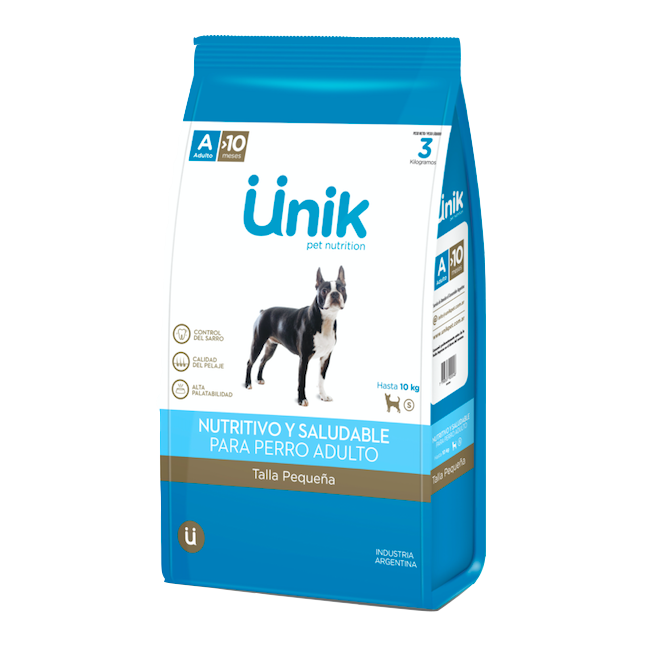 Ünik Pet Perro Adulto Talla Pequeña, cubre las necesidades del perro de talla pequeña a partir de los 10 meses manteniendo su peso ideal, garantizando una buena palatabilidad y salud en general. Incluye: gran concentración de todos los nutrientes esenciales, alta digestibilidad, densidad energética controlada para evitar el sobrepeso, incorporación de antioxidantes, cuidado de la salud dental y del tracto digestivo.